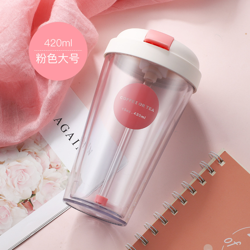 雙層塑料杯翻蓋吸管水杯學生兒童便攜水杯奶茶果汁簡約杯子